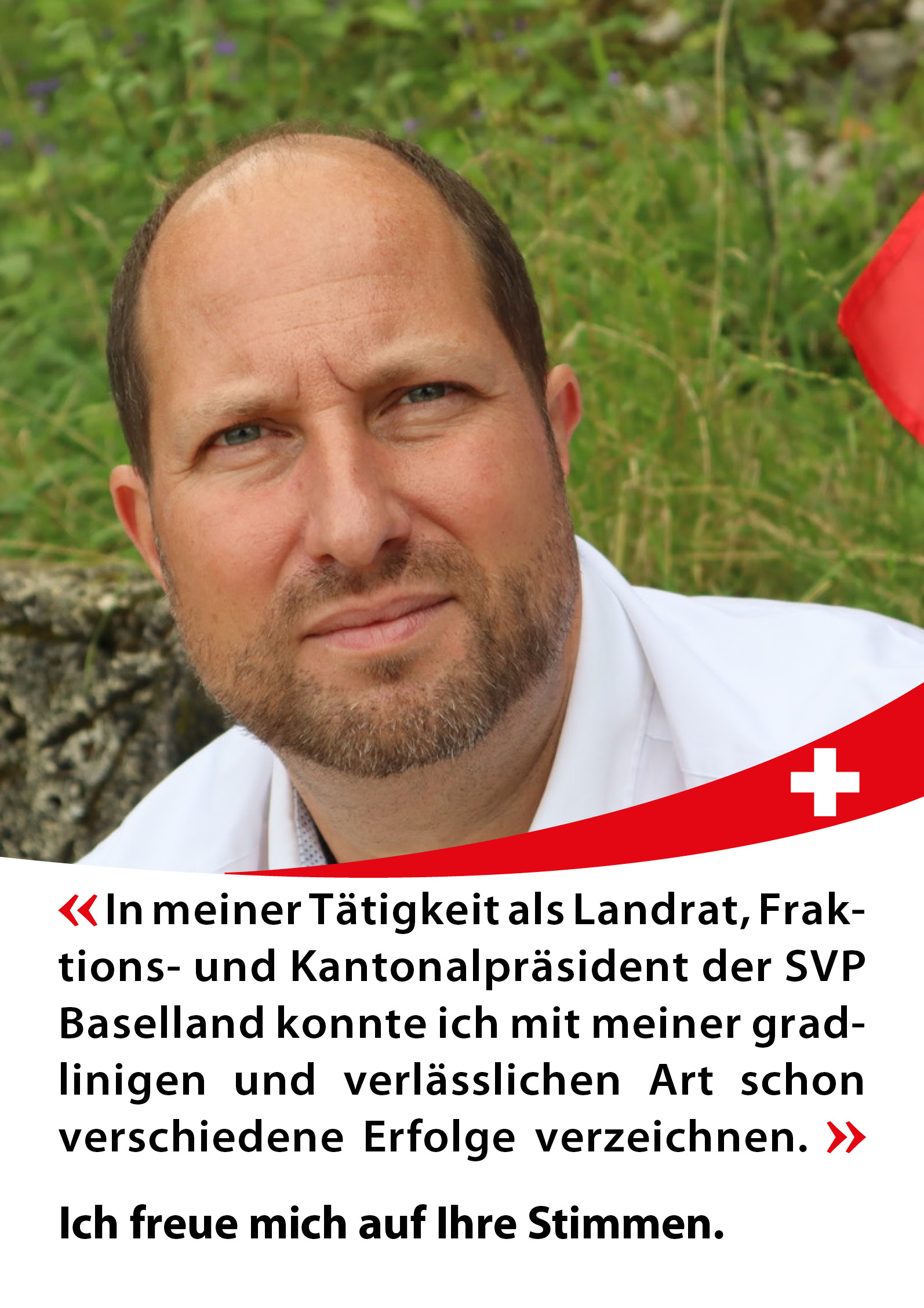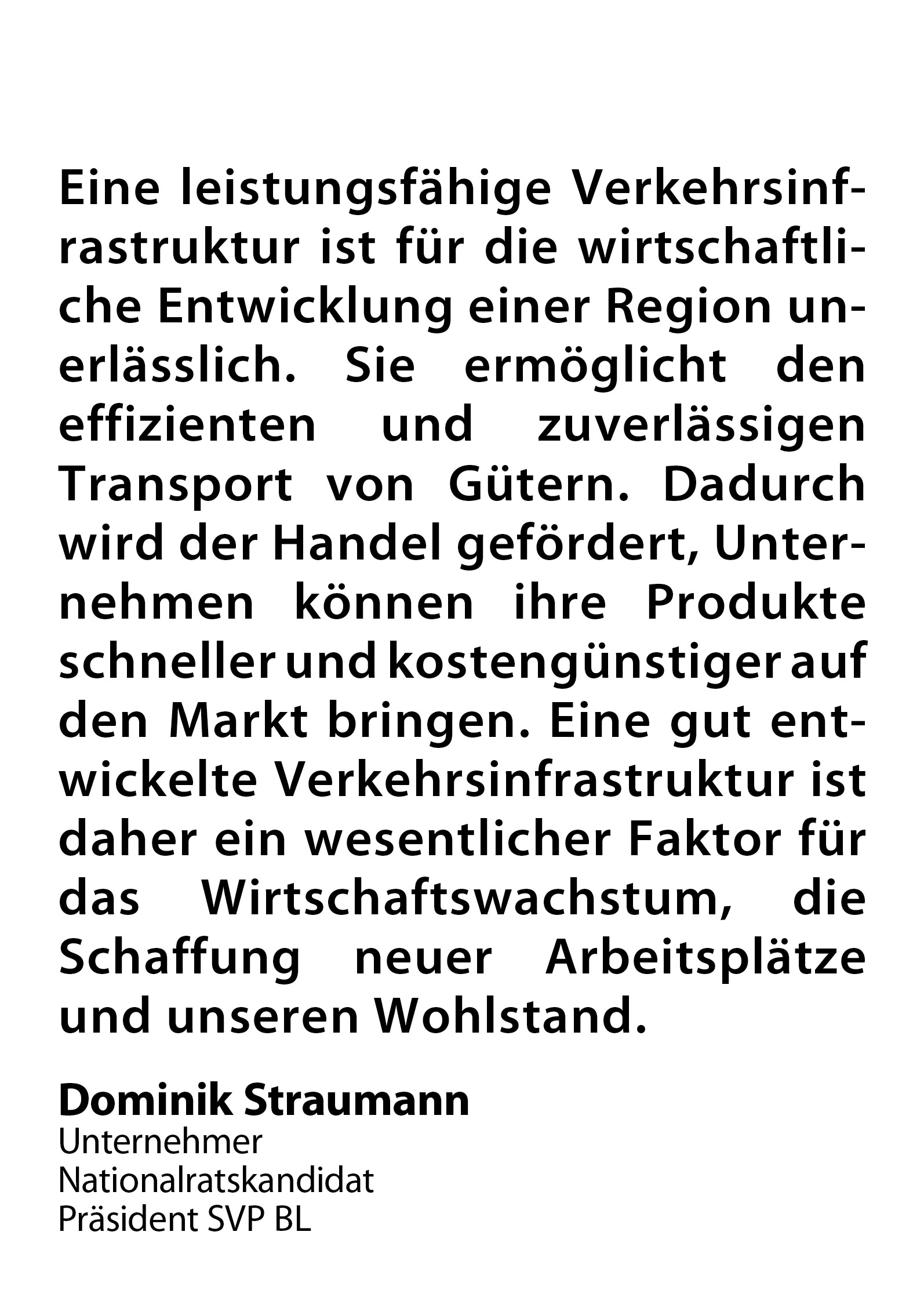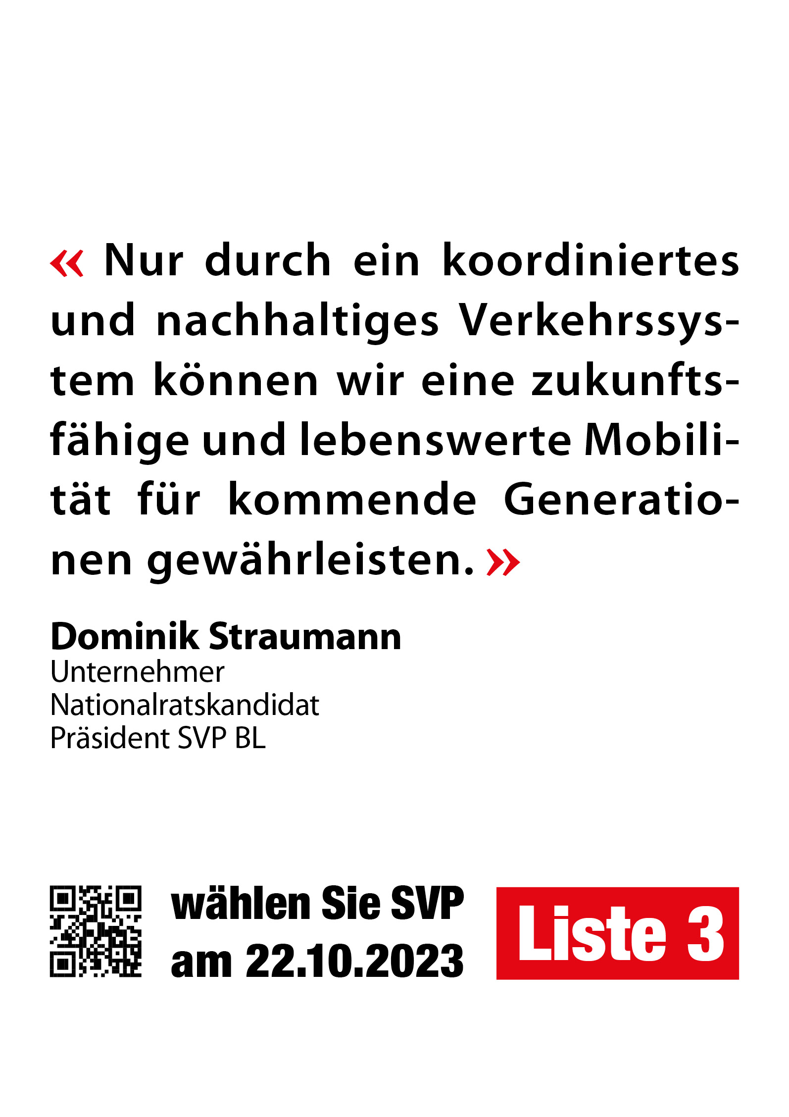 Wenn Sie meine Meinung teilen, dann zähle ich auf Ihre Stimme. Ich werde mich in Bern für eine zweckmässige Verkehrsinfrastruktur für die Region Basel einsetzen. Ich schreibe bewusst für die Region, da wir als Kanton Basel-Landschaft stark betroffen sind, von der gescheiterten Verkehrspolitik der Stadt Basel.